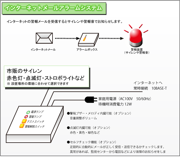 インターネットを通じて、警報メールが届くと本機に接続した警報機に電源が入り、警報ランプやアラームなどが動作開始。